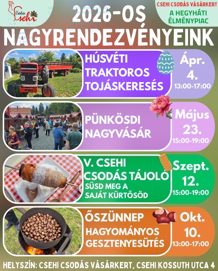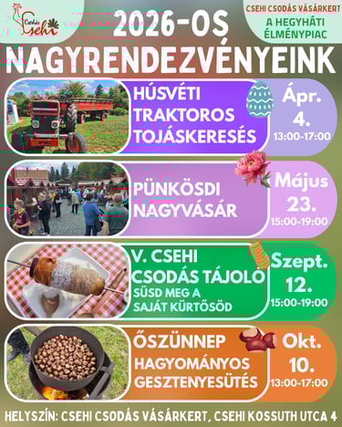 Hosszú évek munkája, tervezgetések, ötletelések után sok szeretettel várunk Csehi kis településére, az újonnan nyíló vásárkertbe!