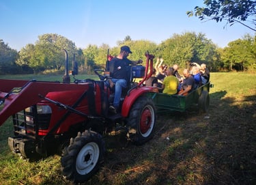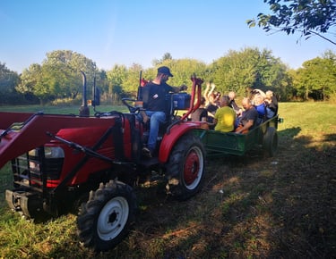 A hegyen földúton keresztül akár gyalog, túrázva jól kijelölt túraútvonalon! Óránként induló traktoros pótkocsin is! A helyek limitáltak, akár előre érdemes jelezni! A pótkocsira csak saját felelősségre szállhatsz fel és 12 éven aluliak csak szülői kísérettel!