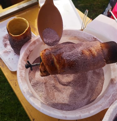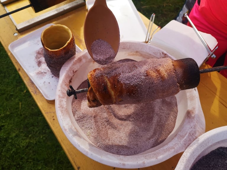 Kürtőskalácsunk receptjét Erdélyből hoztuk, majd kicsit „hegyhátiasítottuk”: a hegyi dió, kerti tökmag is ízesíti.