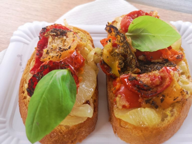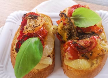 bazsalikomos sült színes paradicsom fűszervajon pirított hagyma és rozscipó ágyon