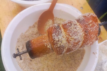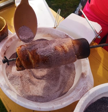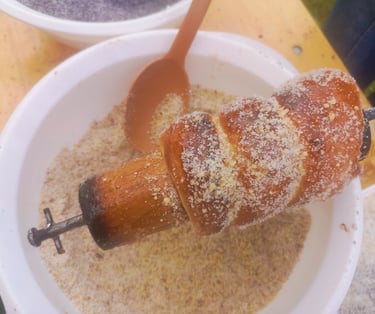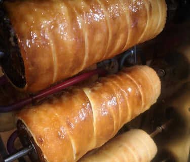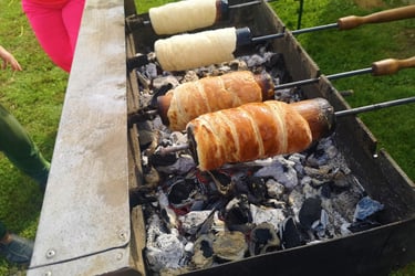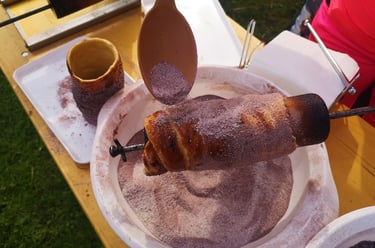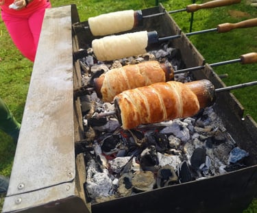 Kürtőskalácsunk receptjét Erdélyből hoztuk, majd kicsit „hegyhátiasítottuk”: a hegyi dió, kerti tökmag is ízesíti.
